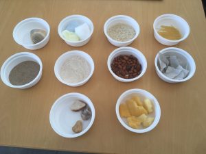 Algumas das texturas utilizadas foram arroz, areia, algodão, farinha, entre outras.