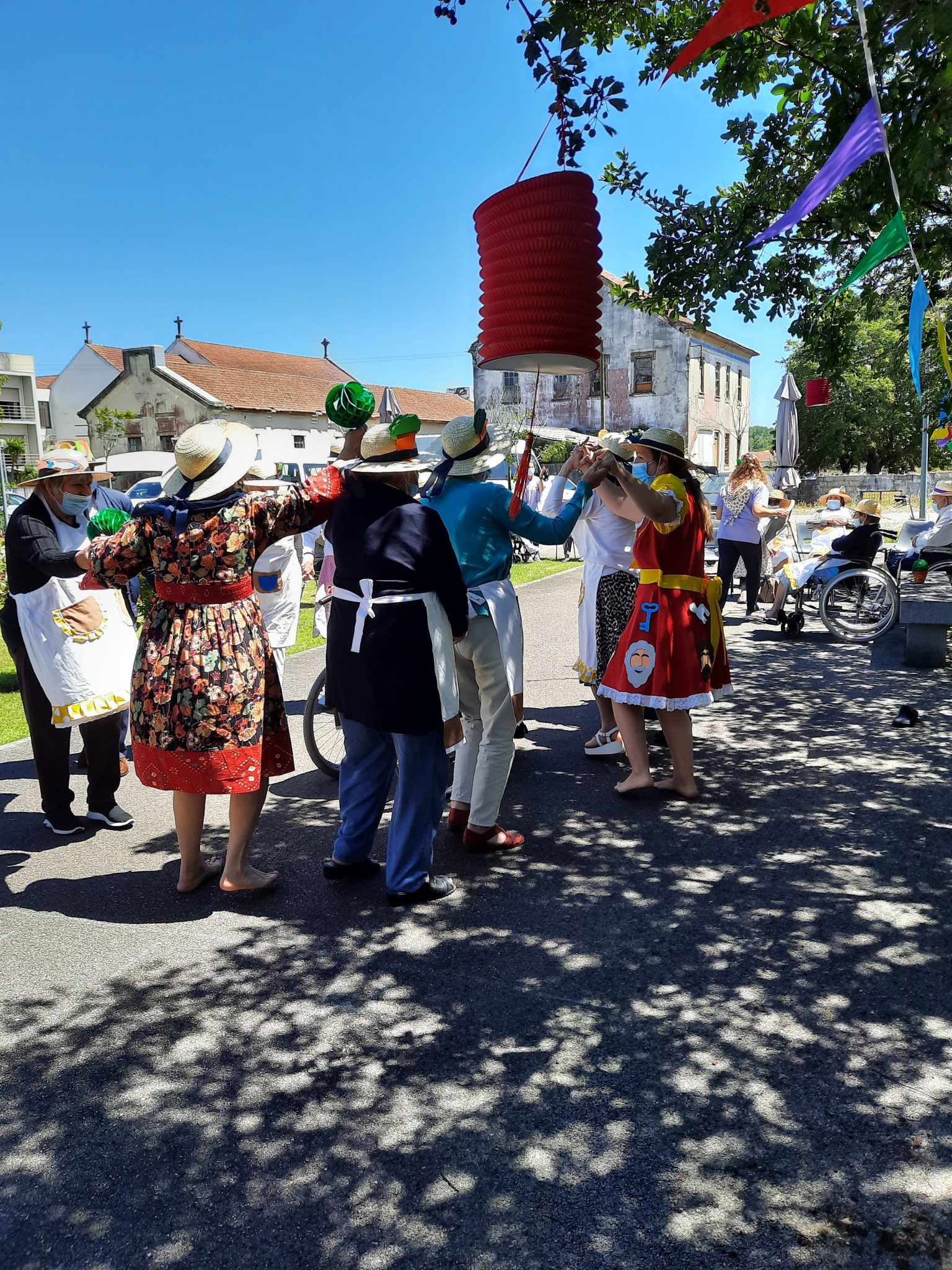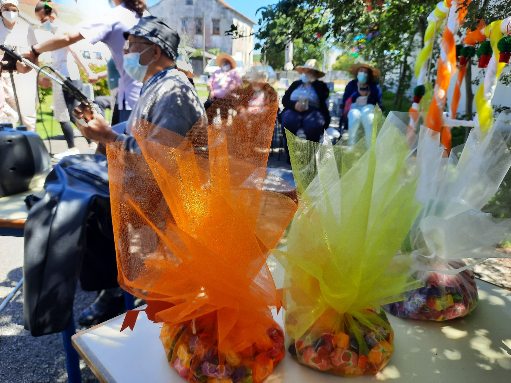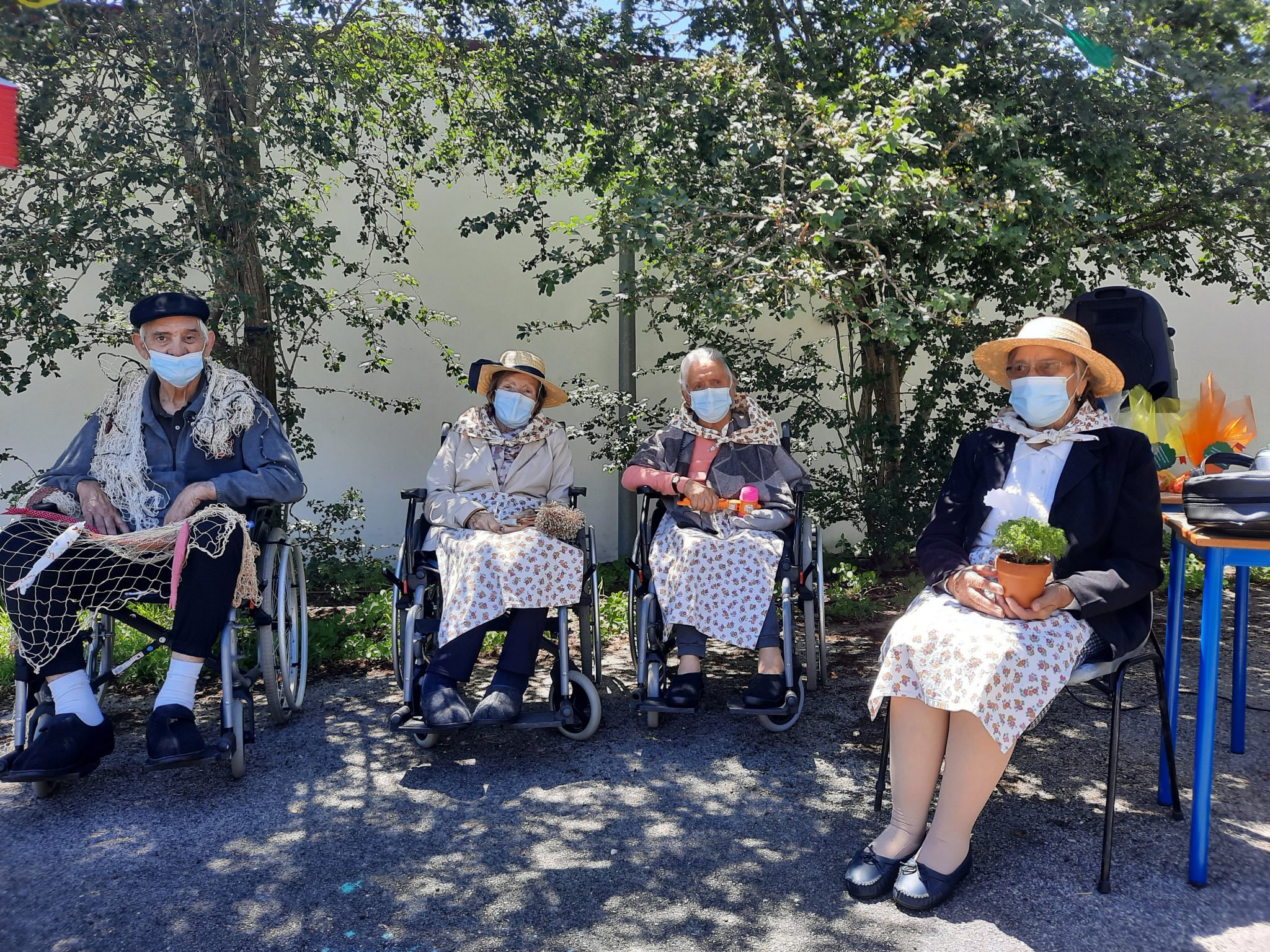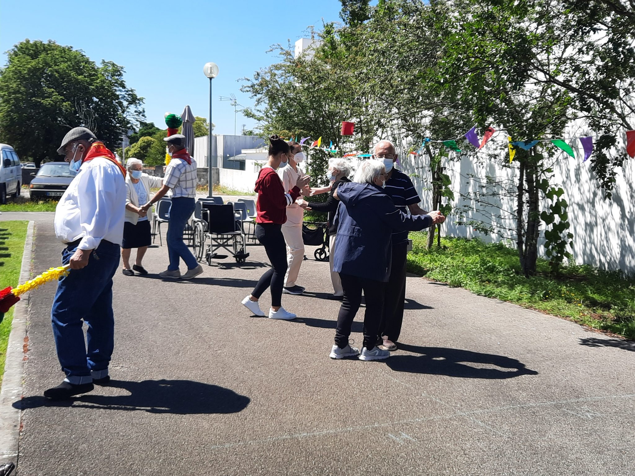 O jardim do Centro de Dia recebeu os convidados, o som de alegres melodias e as tradicionais marchas de São Pedro impulsionaram os festejos numa bela tarde de bailarico intrageracional.