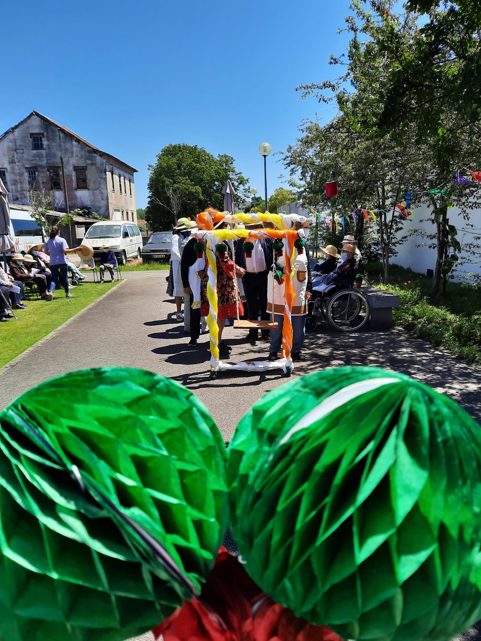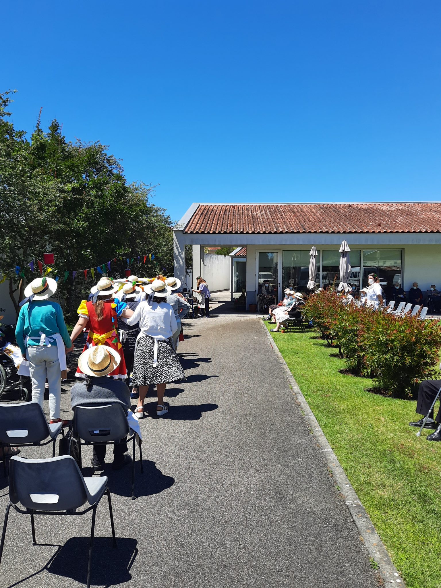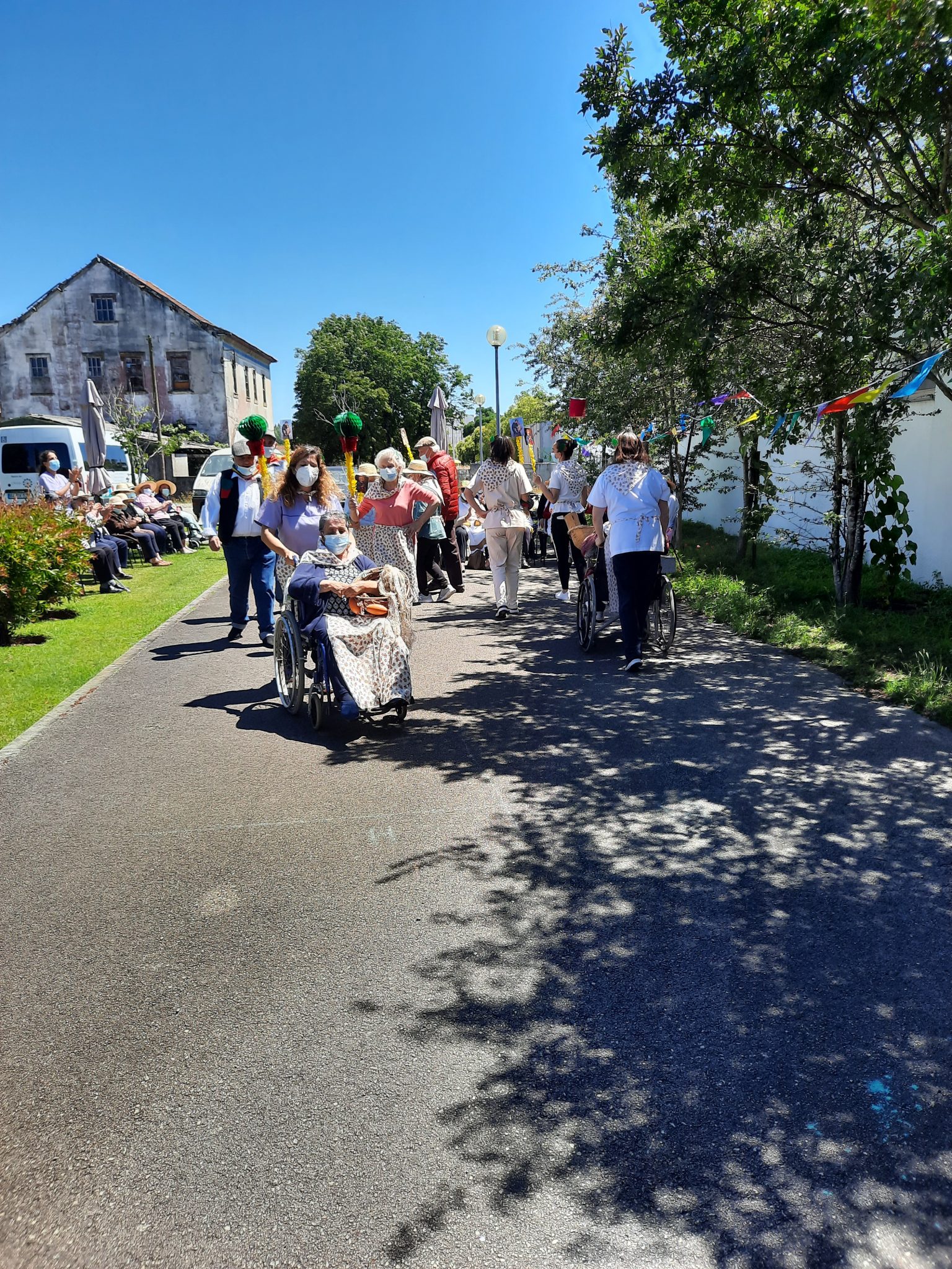 O jardim do Centro de Dia recebeu os convidados, o som de alegres melodias e as tradicionais marchas de São Pedro impulsionaram os festejos numa bela tarde de bailarico intrageracional.