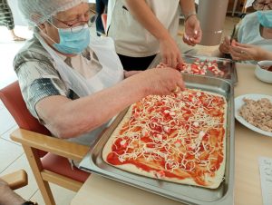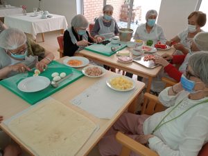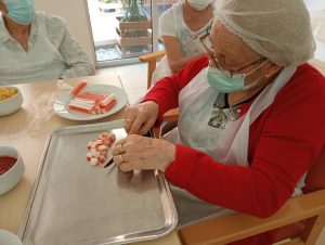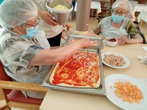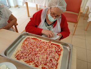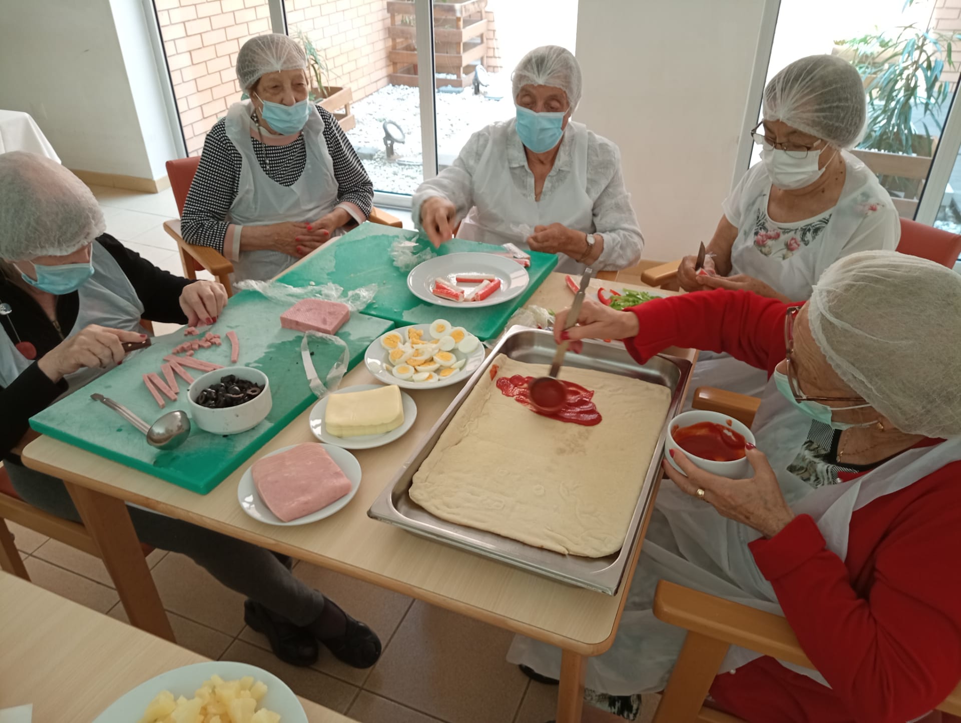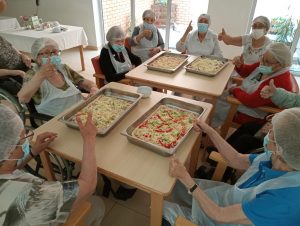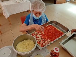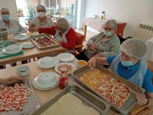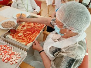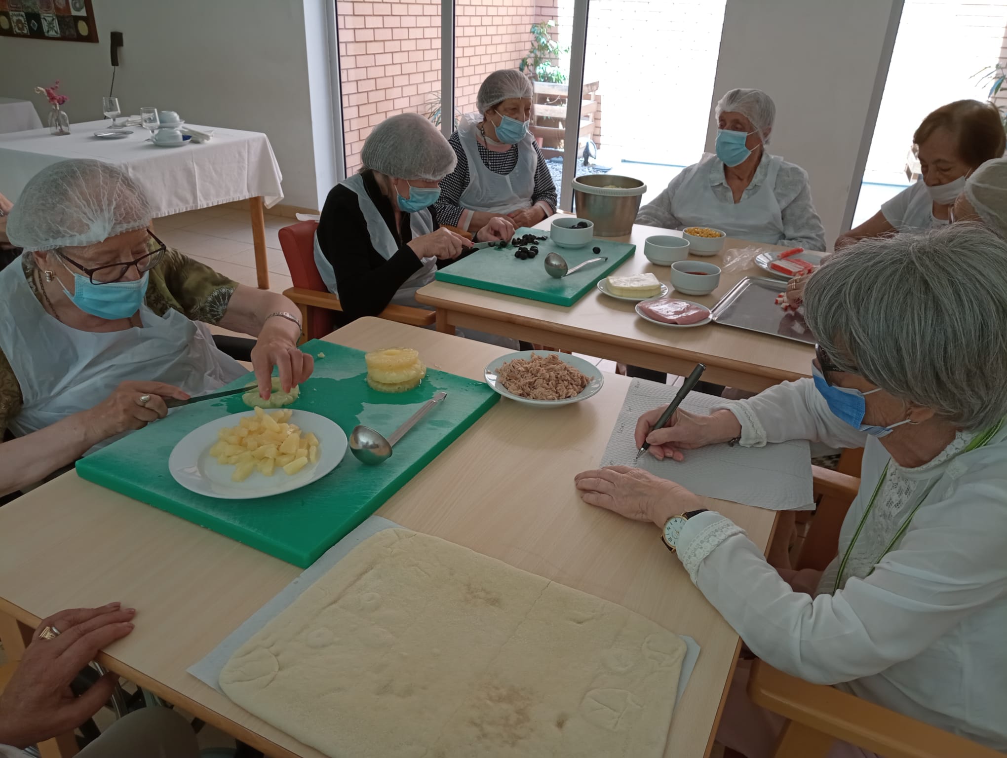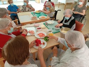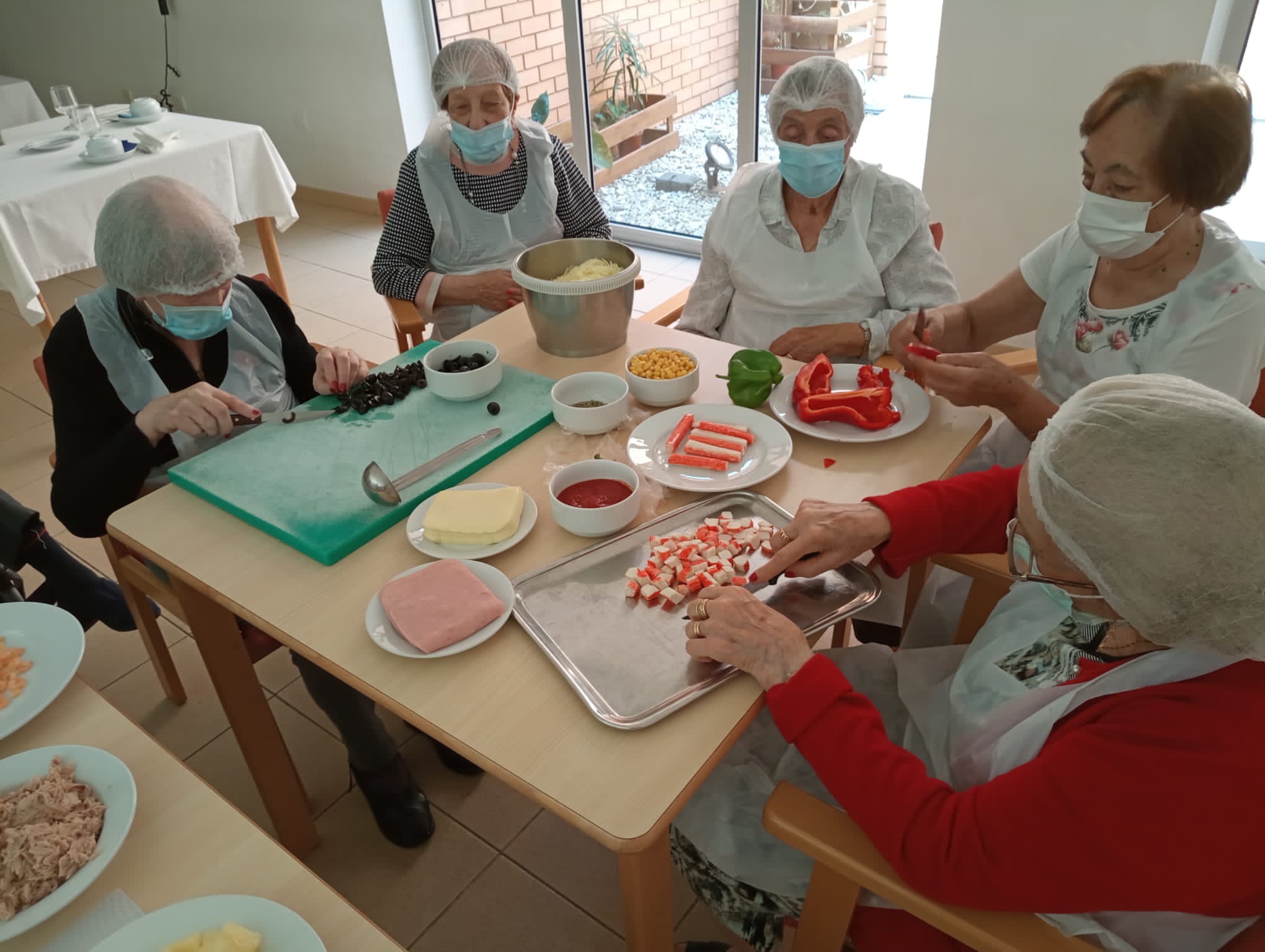 A sessão de culinária do dia 12 de julho foi uma experiência nova para todos os residentes. Habitualmente, confecionamos sobremesas para enriquecer os lanches, mas desta vez, apostamos nas entradas e em novos sabores. Esta atividade proporcionou uma viagem aos 5 sentidos, desde o toque nos alimentos pela experimentação de diferentes texturas, aos estímulos olfativos pela experimentação e variação de essências e aromas agradáveis da dieta mediterrânea, terminando na experimentação de diferentes alimentos. Esta dinâmica de carácter lúdico e prático teve como objetivo proporcionar avivar memórias, promover o raciocínio, atenção e perceção, promovendo a partilha e o convívio. Paralelamente aos benefícios da realização desta atividade, o resultado da tarefa foi aprovado por todos os que provaram a iguaria.