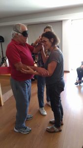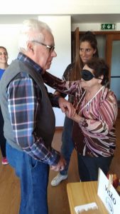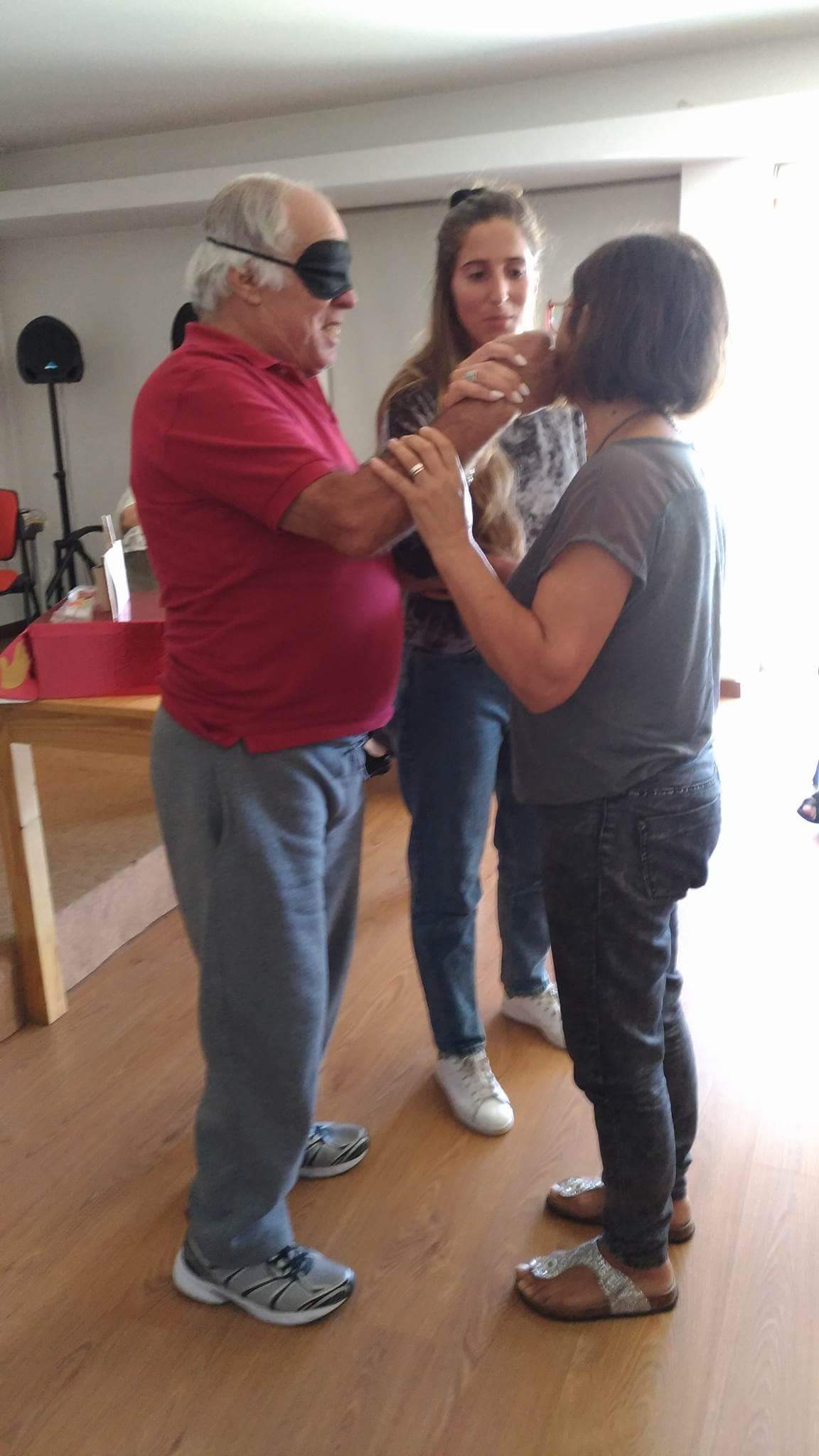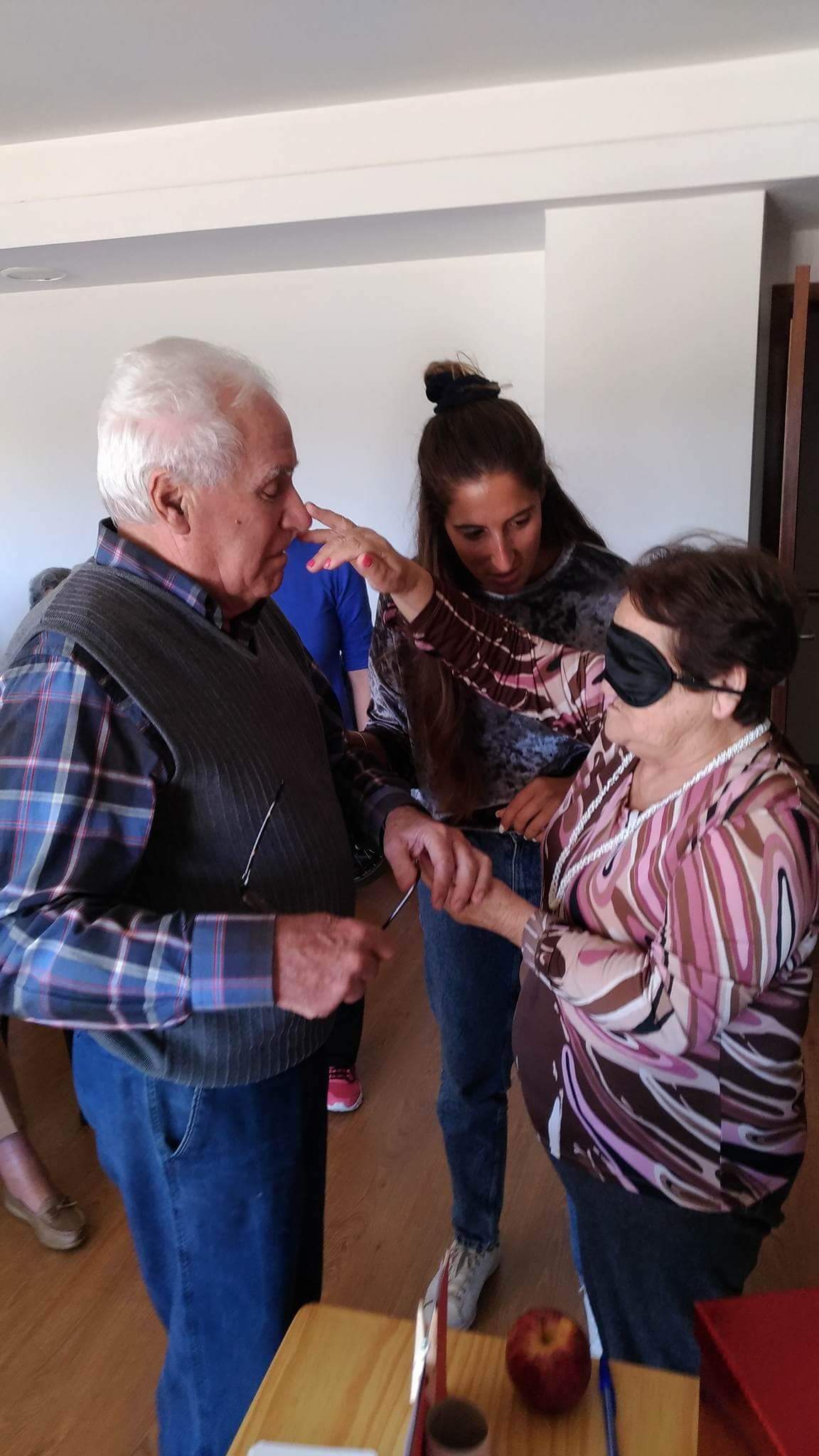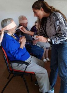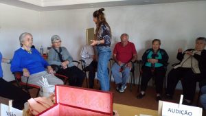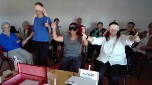 A atividade deu inicio com o sentido do tato através da descoberta do que se encontrava dentro de um saco. Assim como dois idosos, com os olhos vendados, tiveram de adivinhar quem era a pessoa que estava à sua frente.