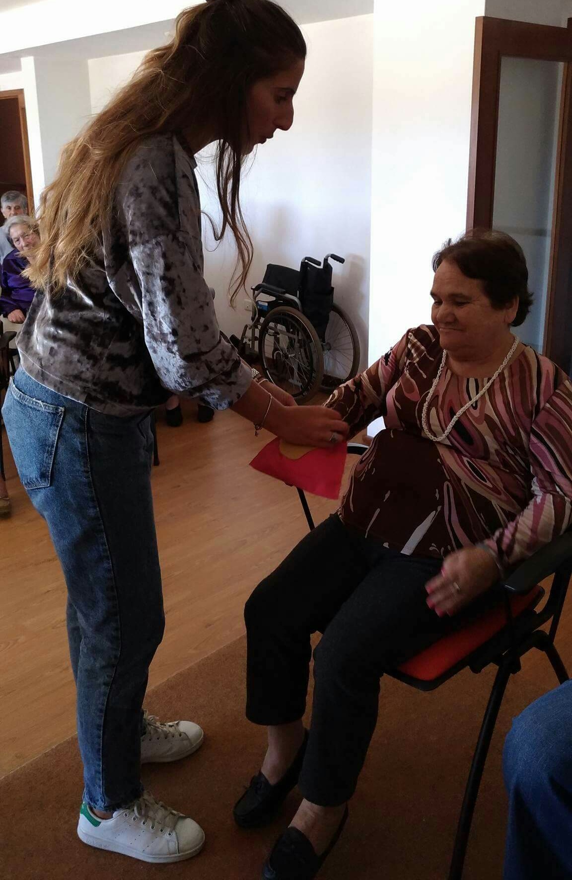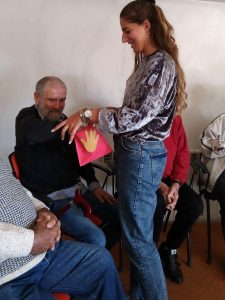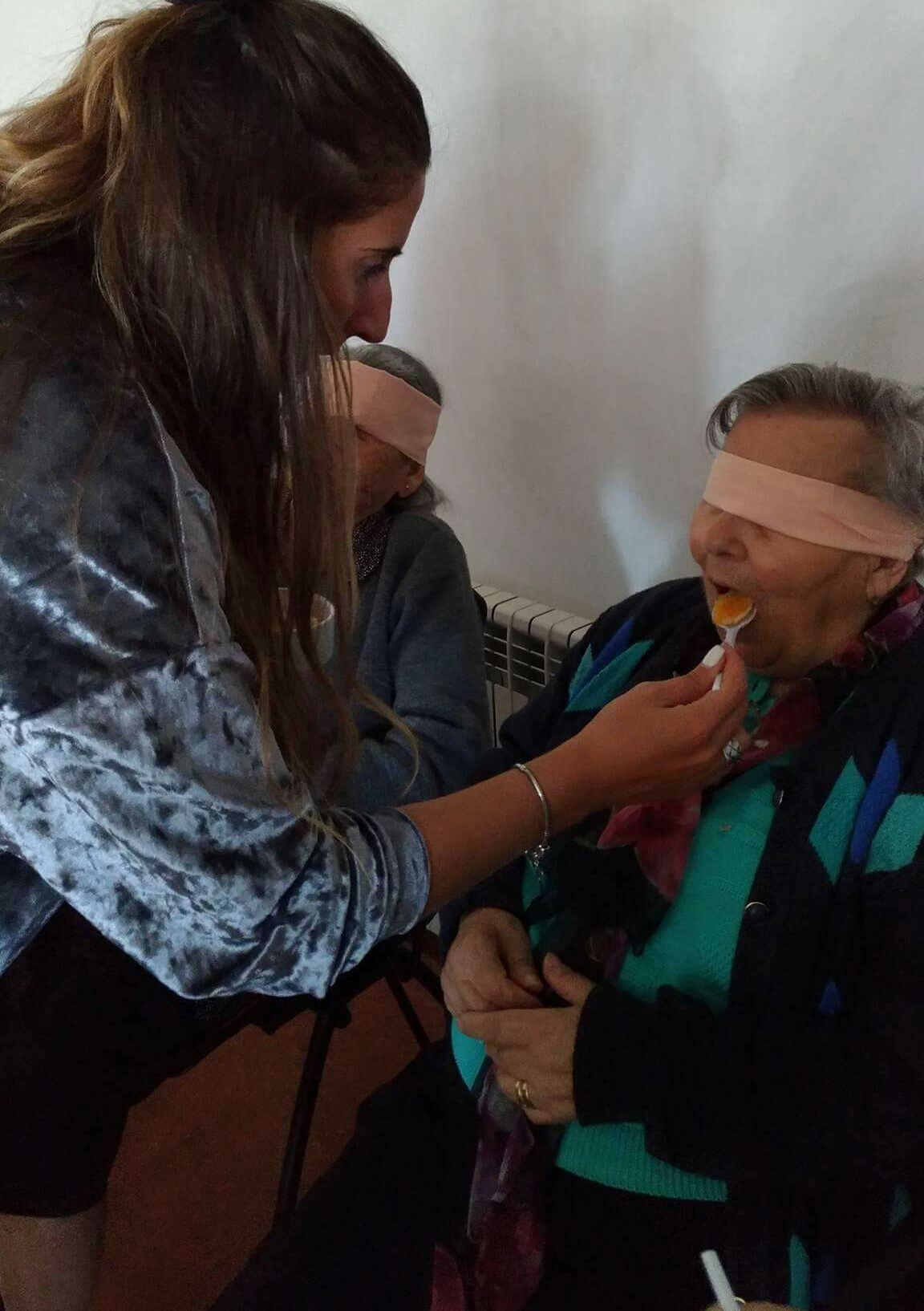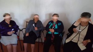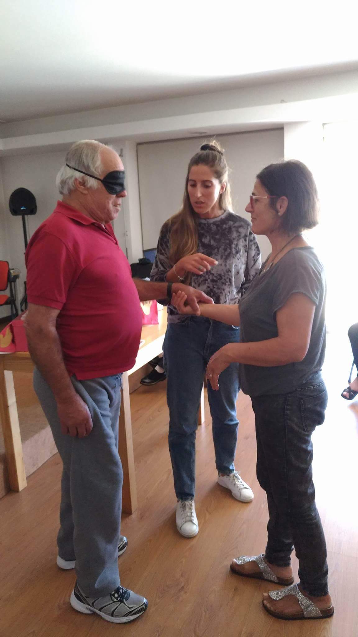 A atividade deu inicio com o sentido do tato através da descoberta do que se encontrava dentro de um saco. Assim como dois idosos, com os olhos vendados, tiveram de adivinhar quem era a pessoa que estava à sua frente.