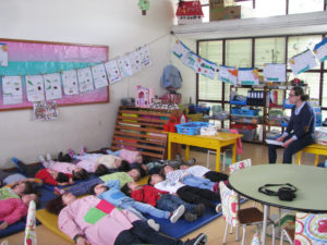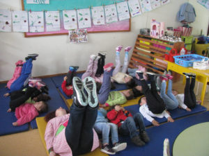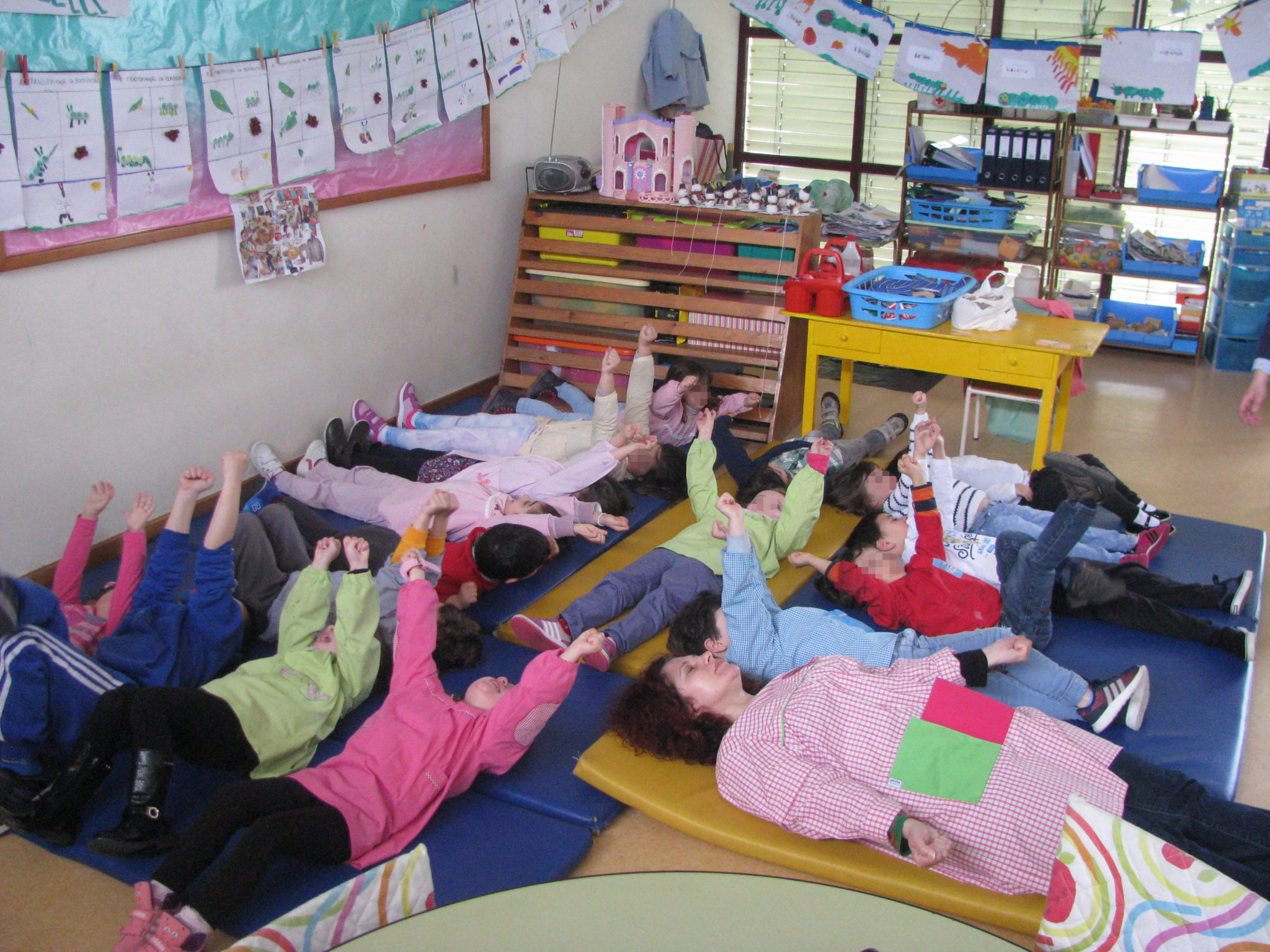 No dia 19 de abril, realizou-se na sala 10 uma sessão de relaxamento muscular adaptada a crianças e orientada por uma mãe de uma criança desta sala, Claúdia Valente, cuja sua formação é Enfermeira com especialidade em Saúde Mental e Psiquiatria.